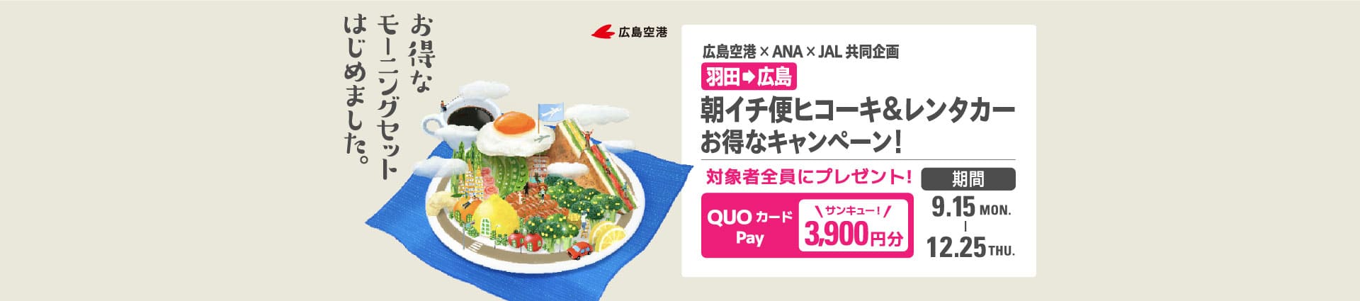 東京(羽田)-広島路線を往復予約し、東京(羽田)発の初便に搭乗、広島空港でレンタカー利用が条件で、先着2,680名にQUOカードPay3,900円分をプレゼントします。