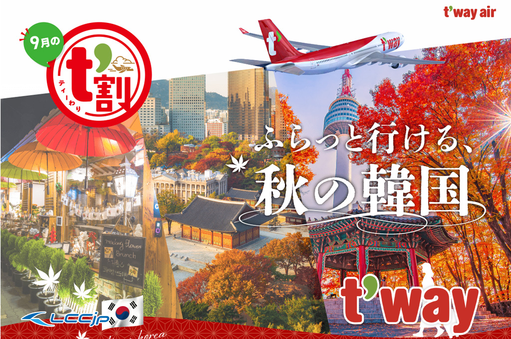 ティーウェイ航空が韓国国際線で片道6,900円からの「t'割(ティーわり)」セールを開始しました。このセールは、専用割引コード「KOREASEP」を使用すると、セール価格が適用され、さらに購入額に応じて最大3,500円の追加割引クーポンを利用できます。