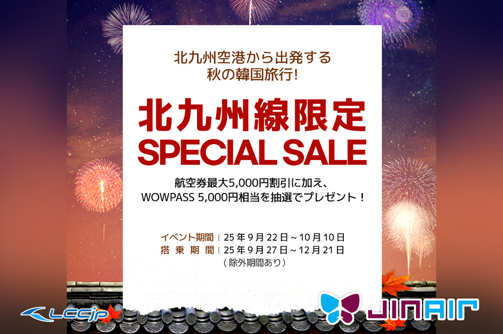 ジンエアーが「北九州線限定 スペシャルセール」を開始しました。国内外旅行者にとって魅力的なこのセールでは、北九州とソウル(仁川)を結ぶ国際線が片道2,500円、往復で最大5,000円の割引となります。先着200名限定でプロモーションコード「25KKJ09」を公式サイトで入力することで利用可能です。また、対象期間中に往復航空券を予約すれば韓国で使用できるWOWPASS 5,000円分が抽選で35名に当たるキャンペーンも同時開催されます。