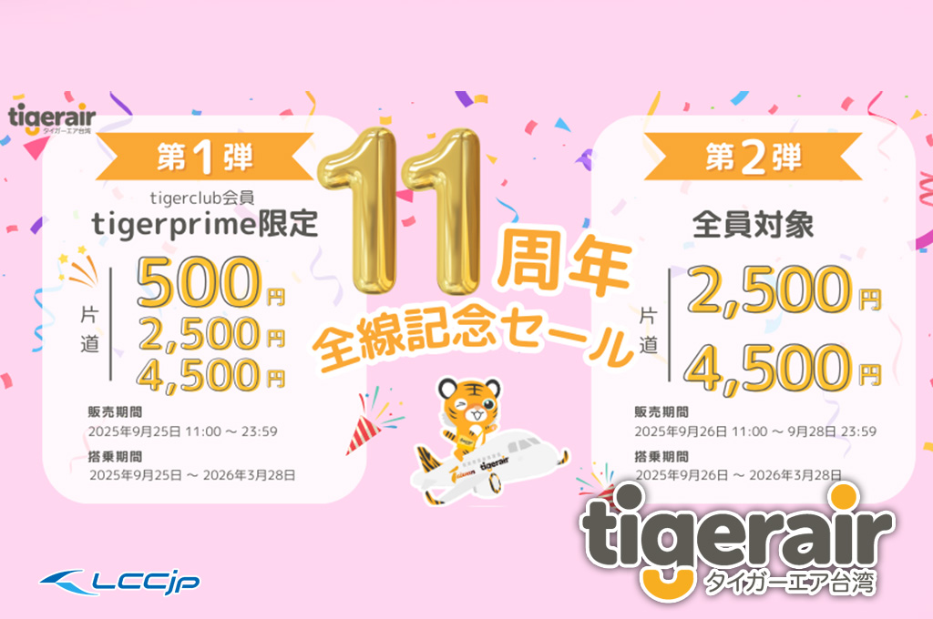 タイガーエア台湾が11周年を迎え、特別なセールを開催します。台湾行きの片道チケットが500円から購入可能です。