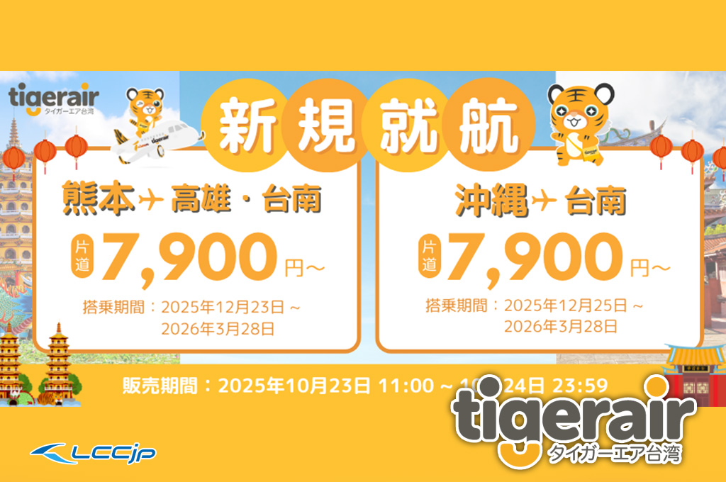 タイガーエア台湾は、新たに熊本と沖縄から台湾への直行便を2025年12月に就航します。これを記念して、新規就航記念セールを開催します。
