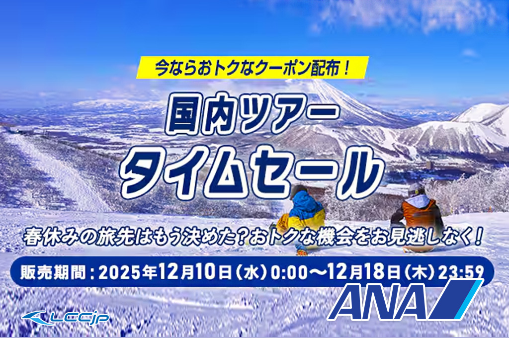 ANAは12月10日0時から「国内ツアータイムセール」を開始します。羽田発の札幌、沖縄、福岡などが対象で、価格は札幌2日間が24,600円から、沖縄3日間が33,700円から、福岡2日間が31,100円から提供されます。特典として最大18,000円や27,000円の割引クーポンが用意されています。また、2〜3月限定でANA Pocket 15万ポイントもプレゼント。